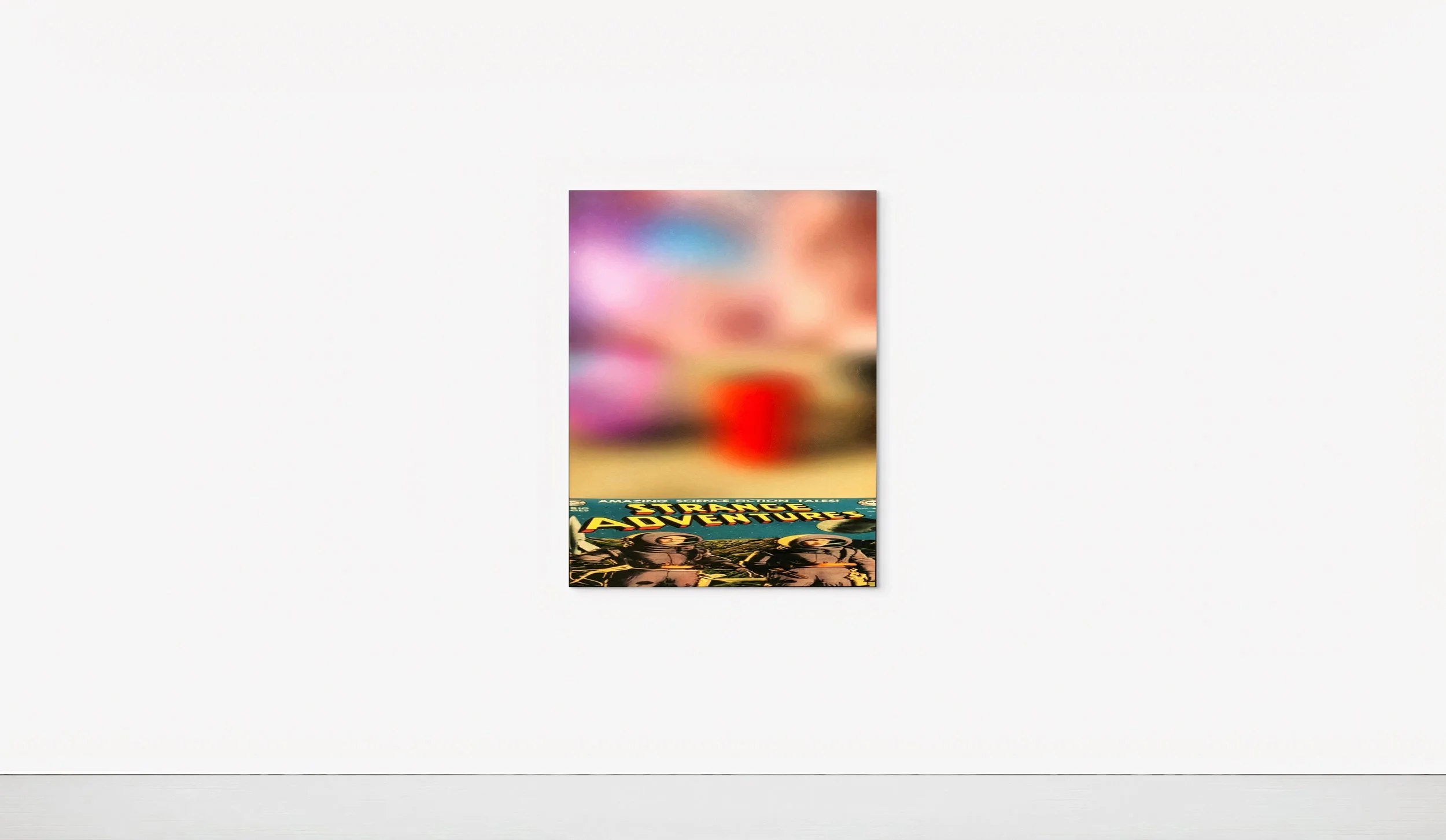 For UPGRADE, Ry David Bradley presents a body of digital paintings vibrating with color, which have been heat-pressed into ultrasuede fabric and sprinkled with holographic glitter. The works resemble saturated photographs that have been blurred beyond recognition or Instagram images from the immediate future that are still in the process of loading. At the bottom of each digital painting is a deliberately stretched and pixilated “free app store style” banner ad, whose content comes inexplicably from a pre-digital universe. Juxtaposed against the hyperreality of Bradley’s digital paintings, the banners, which include vintage comic book ads from the 1950s and 60s, advertise a world that no longer exists. UPGRADE reminds the viewer that even as we stand on the cutting edge of technology and culture, watching a new world come into focus, a small piece of history is always present even in the most contemporary things today.