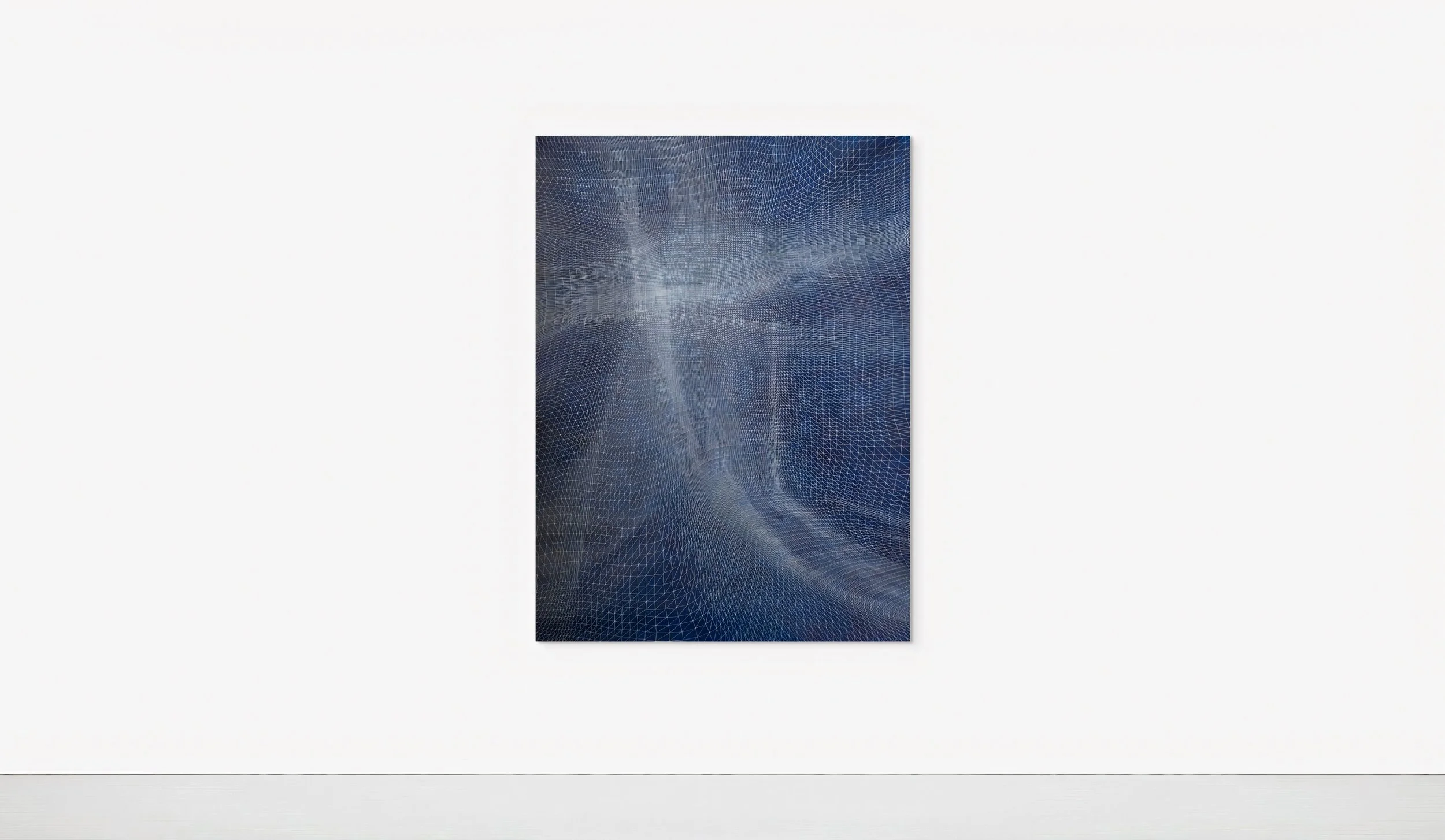 Messenger’s Blue Veil paintings are composed according to the Fibonacci sequence, the mathematical formula behind the Golden Spiral pattern in nature and art. Messenger paints outward from the center of each piece in successively expanding grids of triangles. Since he paints freehand without the use of rulers or straight edges, the natural variance of the artist’s touch softens and bends the underlying mathematical structure, producing diaphanous waveforms that feel sumptuous and organic.